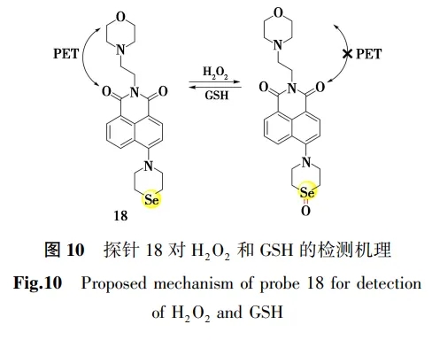 2022年,Ma等[47]设计并制备了一种新型H2O2荧光探针18(图10)。研究发现,该探针遵循硒啡啉中的Se(Ⅱ)转化为Se(Ⅳ)的机制,从而改变了探针17的光谱,并在533 nm处产生显著改善的荧光信号。