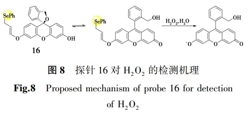 2020年,Pham等[45]报道了一种硒化合物荧光探针16(图8),可以通过Mislow-Evans重排反应实现H2O2选择性检测。该探针解决了小分子亲电探针H2O2在生物系统中需要很长时间才能产生充分反应的问题。