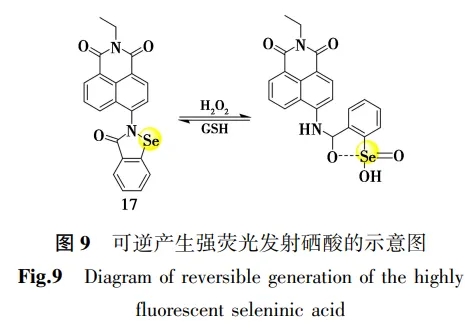2020年,Ungati等[46]通过将萘酰亚胺荧光团与具有氧化还原活性的Ebselen连接起来合成了荧光探针17。由于探针与H2O2反应产生-SeO2H,-SeO2H具有强的吸电子能力,阻止了萘甲酰亚胺结构的PET过程,使其表现出强荧光发射。