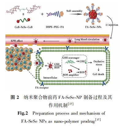 如图2所示,Chen等[17]设计开发了一种二硒键(Se-Se)接枝叶酸(Folic Acid,FA)的二聚体前药(FA-SeSe-NPs),用于破坏TNBC的肿瘤细胞内的氧化还原稳态,达到靶向治疗的目的。
