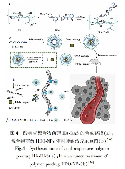 Zeng等[26]通过协同达沙替尼(Dasatinib,DAS)和奥拉帕利(Olaparib,OLA)设计了具有活性亲水性透明质酸(HA)靶向和酸响应的用于TNBC治疗的纳米聚合物前药,如图4所示。