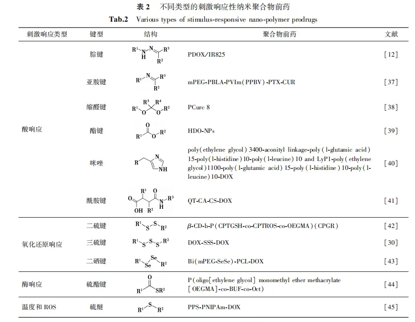 表2列出了应用于肿瘤治疗的不同刺激响应类型的聚合物前药。