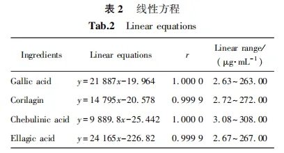 精密量取1 mL混合对照品溶液1,分别置于 2、5、10、25、50 mL 棕色量瓶中,加甲醇定容,得系列混合对照品溶液,进样测定,并基于测得的峰面积(y)和质量浓度(x)的数据,绘制标准曲线,线性方程见表2。