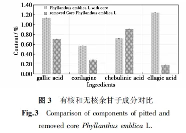 通过比较,有核余甘子中没食子酸、柯里拉京、鞣花酸的含量均高于无核余甘子。而无核余甘子中诃子酸高于有核余甘子。说明余甘子果核中含有没食子酸、柯里拉京、诃子酸和鞣花酸。