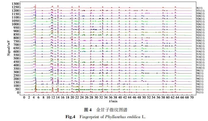 为了更全面、准确地评估余甘子的质量,本试验在相同条件下测定了余甘子中4种关键成分(没食子酸、柯里拉京、诃子酸、鞣花酸)的含量。结合指纹图谱或特征图谱的分析方法,本试验为余甘子的质量控制评价提供了一种更为全面、科学的新途径。这种方法的运用,不仅增强了评价的专属性,也提高了评价的准确性和可靠性,对于确保余甘子药材的质量和药效具有重要意义。