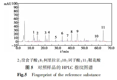 记录色谱图,将其导入“中药色谱指纹图谱相似度评价系统”,分析S1 ~ S32号余甘子HPLC色谱图[14,15],选取11个峰为共有峰,得到特征图谱,见图4;余甘子的共有模式图谱见图5。