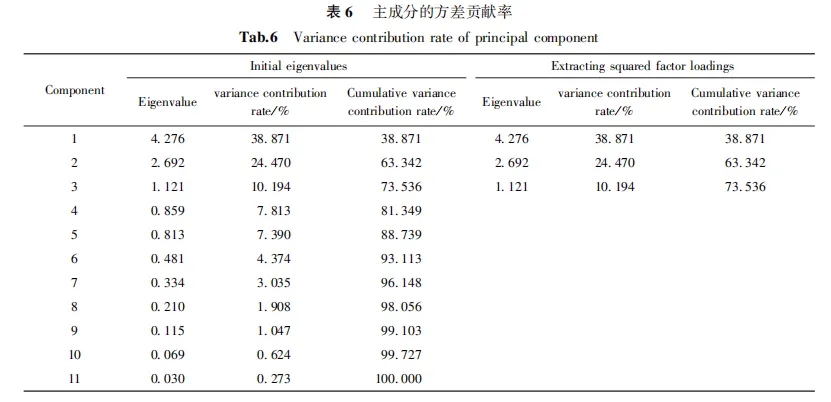 将S1 ~ S32号余甘子11个共有峰的峰面积依据主成分的特征值和贡献率,对其进行主成分分析。主成分分析选取3个主成分,特征值分别为4.276、2.692、1.121,累积方差贡献率分别是38.871 %、63.342 %、73.536 %,结果见表6。