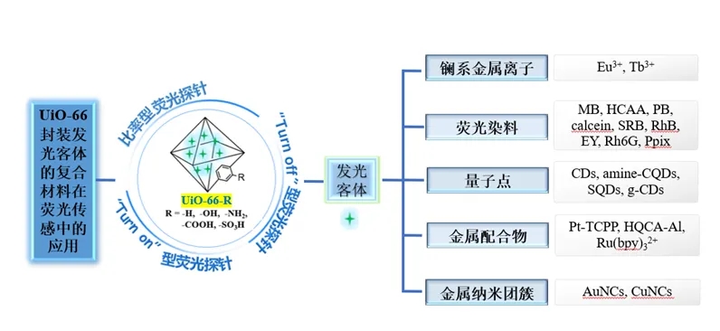 2.介绍了UiO-66封装不同发光客体构建的比率型、“Turn on”、“Turn off”荧光探针在荧光传感中的应用;