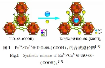 以复合材料Eu3+/Cu2+@UiO-66-(COOH)2[13]的合成为例,具体合成过程为:先通过溶剂热法制备得到UiO-66-(COOH)2,再将UiO-66-(COOH)2、Eu(NO3)3‧6H2O、Cu(NO3)2‧2.5H2O的混合物在蒸馏水中加热,制得Eu3+/Cu2+@UiO-66-(COOH)2,如图1所示。