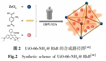 一锅溶剂热合成法(One-Pot Solvothermal Synthesis),简称“一锅法”。这种封装方法可以简单地描述为在形成MOF结构之前,将发光客体分子直接与MOF的基本构建模块,即金属源和有机配体在同一容器中混合。例如复合材料UiO-66-NH2@RhB[48]的合成,如图2所示。