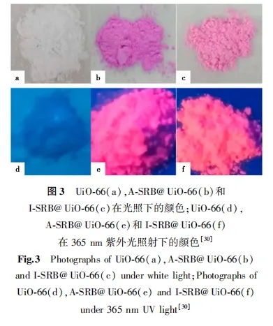 Ruan等[30]分别采用了两种方法将荧光染料SRB封装在UiO-66中,其中后合成修饰法得到的荧光材料为A-SRB@UiO-66,一锅法合成的荧光材料为I-SRB@UiO-66,如图3所示。