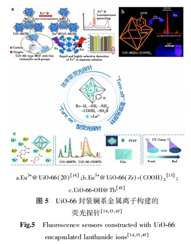镧系金属离子如Eu3+、Tb3+具有独特的发光特性,发射峰窄、斯托克斯位移大、荧光强度强、寿命长等优点[54],因此将镧系金属离子封装到UiO-66、UiO-66-(COOH)2、UiO-66-NH2、UiO-66-SO3H、UiO-66-OH框架中构建新型荧光传感器的研究较多,主要包括“Turn on”型荧光探针、“Turn off”型荧光探针和比率型荧光探针,如图5所示。