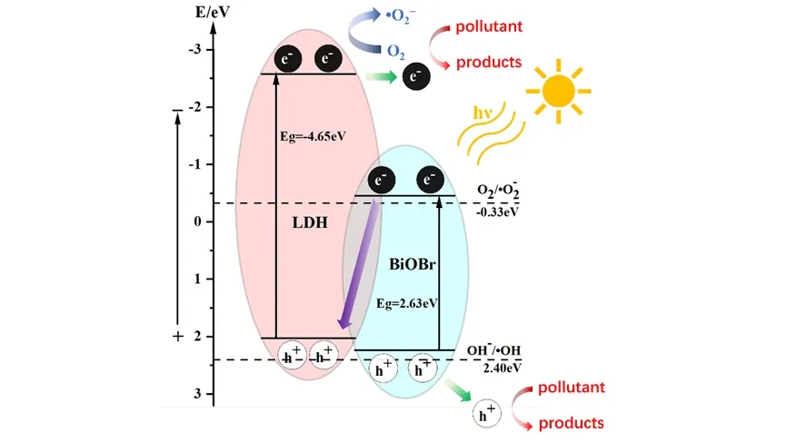 由于Z型异质结结构,加强了光生电子-空穴分离,铝碳酸镁的EC中的光生电子捕获溶解在H2O中的O2,将其还原为强氧化性的•O2−;•O2−可以将TC-HCl氧化为无机物,并且未参与反应突破限制的自由光生电子可以直接将TC-HCl降解为CO2和H2O,同时h+可以协同氧化TC-HCl。由于以上机理,铝碳酸镁/溴氧化铋异质结具有极强的光催化活性。