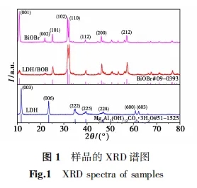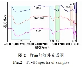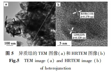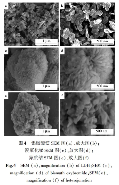 3.1 采用水热法合成了铝碳酸镁/溴氧化铋异质结光催化剂,该材料由铝碳酸镁纳米片和在其上原位生长的溴氧化铋纳米棒构成,维度调控使其具有独特的纳米棒均匀负载于纳米片上的2D/1D结构,并且铝碳酸镁和溴氧化铋有紧密的结合。