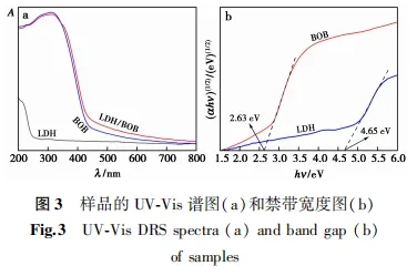 图3显示了铝碳酸镁、溴氧化铋和异质结的紫外-可见吸收光谱图和铝碳酸镁、溴氧化铋的禁带宽度图。从图3a可以看出,铝碳酸镁的吸收边缘小于400 nm,说明铝碳酸镁仅对紫外光有吸收,而对可见光吸收效果不佳;溴氧化铋的吸收边缘约为440 nm,铝碳酸镁/溴氧化铋异质结的吸收边缘约为460 nm,异质结光催化剂对可见光吸收更强。根据图3b的估算结果,铝碳酸镁的禁带(Eg)值约为4.65eV,溴氧化铋的Eg值约为2.63eV,均与文献[16,17]接近。
