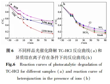 为了进一步考察不同样品的光催化活性,在光催化反应器中进行TC-HCl的可见光降解实验,结果如图6a所示。进一步探索了异质结光催化剂在含有不同离子的溶液中的光催化性能,以研究杂质离子对其性能的影响,所有离子浓度均为5 mmol/L,结果如图6b所示。