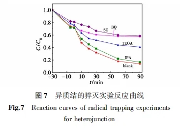 分别选用对苯醌(BQ)、草酸钠(SO)、三乙醇胺(TEOA)和异丙醇(IPA)捕获•O2−、e−、h+和•OH,根据异质结光催化反应效率降低的程度来评价这些活性物种各自对异质结光催化反应的贡献[16],结果如图7所示。