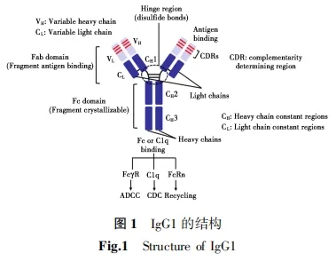 治疗性mAbs分子量约150 kDa,目前临床上大多数抗体药物是IgG1型抗体[13]。IgG1主要由两条分子量约为50 kDa的相同重链、两条分子量约为25 kDa的相同轻链以及铰链区三部分组成具有特定空间结构的四肽链结构[14],其中轻重链通过一对链间二硫键相连,两条重链之间通过含有两对链间二硫键的铰链区连接。根据氨基酸序列的变异程度可将单抗的轻重链划分为独特的可变区(V区)和保守的恒定区(C区)两种结构域,分别对应可变轻链VL、恒定轻链CL和可变重链VH、恒定重链CH1、CH2、CH3(图1)。.jpg)