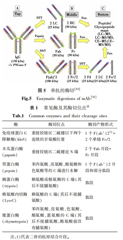传统单抗生产纯化工艺如过滤法、蛋白沉淀法、离子交换层析法等利用蛋白质共有的物化特性实现简单的初步分离,其富集纯化往往不具有选择性。然而抗体药物体内分析的临床样本往往来自人体血清,面临血清复杂基质中内源性成分非特异性干扰的挑战,血清蛋白种类丰富,其中白蛋白和免疫球蛋白约占蛋白总重量的75%[33],因此如何开发高效精准识别的富集纯化方法对后续mAbs体内准确的修饰分析至关重要。2.2 酶切策略