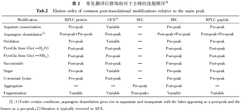 由于抗体发生修饰可能会不同程度地改变其疏水性、表面带电分布等理化性质,导致不同分离机制的色谱方法对各种修饰变异体的保留和分离产生显著差异(表2)[60]。.jpg)
