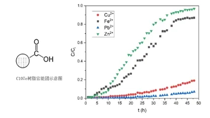 酸性矿山废水中包含Fe、Cu、Pb、Zn等重金属,对人类健康和环境安全构成严峻威胁。含特定官能团的离子交换树脂具有吸附容量高、吸附速率快、操作简单的特点,对金属离子可表现出不同的亲和力,实现选择性吸附,减去其负面影响。漂莱特C107e中的羧基官能团(-COOH)能为去除金属离子提供吸附点位,且不溶于酸性废水、与酸性废水中游离的酸根离子结构相似,吸附表现更为稳定。然而,目前酸性官能团树脂在弱酸介质中对重金属离子的选择吸附性能及吸附动力学暂不明晰。因此,有必要开展相关研究。