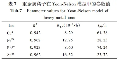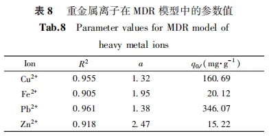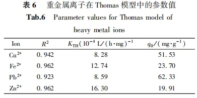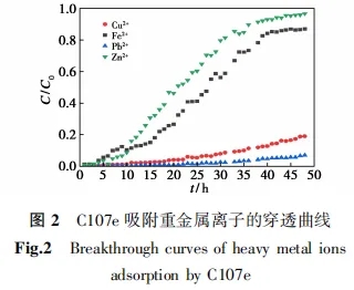 C107e树脂在乙酸介质中吸附4种重金属离子的亲和力排序为Pb2+>Cu2+>>Fe2+>Zn2+。经过48 h的吸附,Pb2+、Cu2+、Fe2+、Zn2+的总吸附容量达到39.83、38.98、32.00、29.99 mg/g,说明该树脂对以上离子具备良好的选择吸附性能,为后续酸性废水治理提供了新思路。Thomas、Yoon-Nelson和MDR模型均能较好地描述4种重金属离子的穿透曲线,但适用场景不同,其中Yoon-Nelson模型可预测给定出口浓度下可处理的含金属离子的废水体积,可用于实际吸附工艺设计;MDR模型适用于拟合穿透曲线的初始部分;Thomas和MDR模型预测的饱和吸附容量均与实验所得数值有较大误差,不具备参考价值。