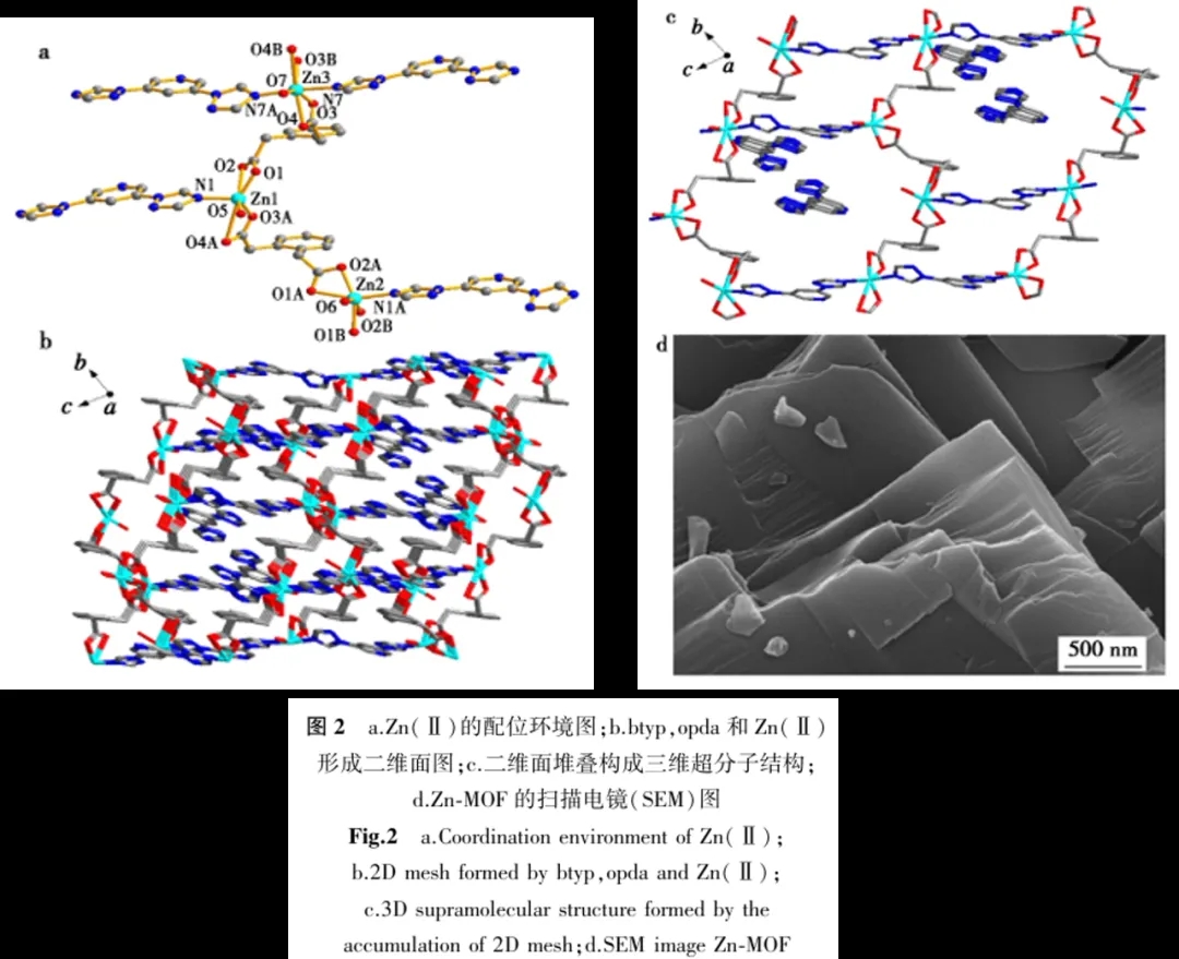 1.选用柔性的1,2-苯二乙酸 (H2opda)和刚性的3,5-二(三氮唑)吡啶 (btyp) 作为有机配体,合成了一种新型的二维配位聚合物[Zn3(btyp)2(opda)3(H2O)3]·(btyp)(H2O)3(Zn-MOF);