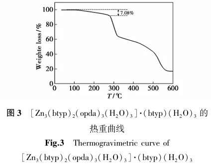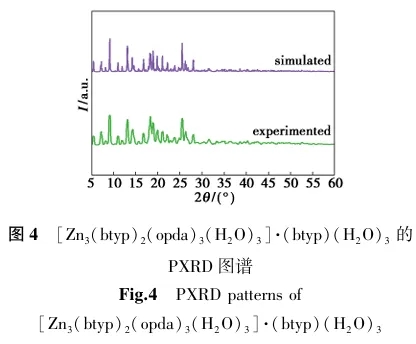 图4为[Zn3(btyp)2(opda)3(H2O)3]·(btyp)(H2O)3的粉末X射线衍射(PXRD)图,电压为40 kV、电流为30 mA、扫描范围为5°~ 60°。