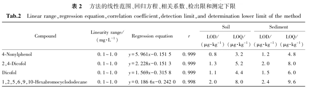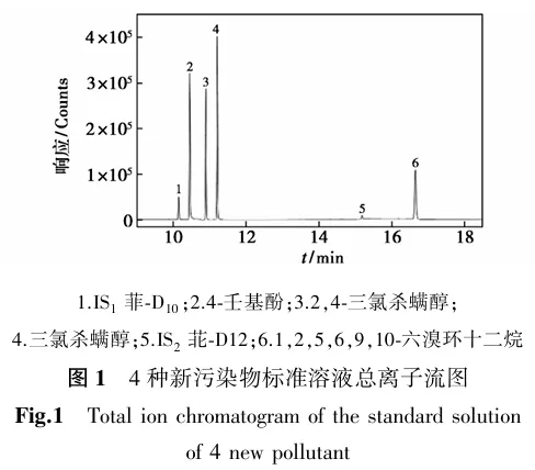 以V(正已烷):V(丙酮)=1:1为溶剂,分别配制质量浓度为0.1、0.2、0.5、0.8、1.0 mg/L的4种新污染物混标溶液,并加入适量内标物保持其浓度为0.5 mg/L,按照1.3仪器设定条件依次进样分析,性能参数见表2。.jpg)