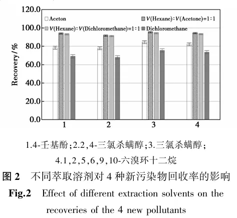 实验选取阴性空白土壤样品10 g,添加5 μL(100 mg/L)的混标溶液,固定萃取温度为100℃,分别考察了丙酮、V(正已烷):V(丙酮)=1:1、V(正已烷):V(二氯甲烷)=1:1、二氯甲烷4种萃取溶剂对4种新污染物回收率的影响,各进行3次平行实验,按照1.2条件设定进行浓缩、净化,1.3仪器设定上机测试。.jpg)