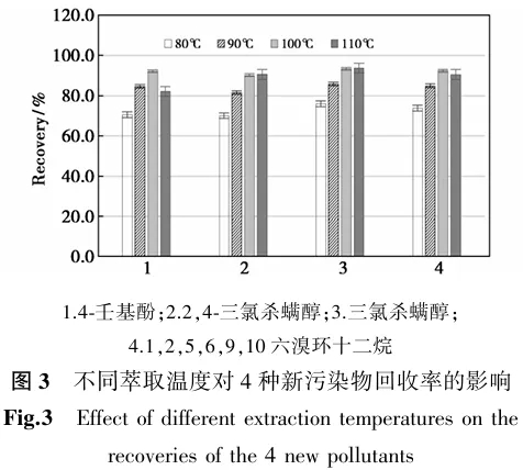 实验选取阴性空白土壤样品10 g,添加5 μL(100 mg/L)的混标溶液,固定萃取溶剂:V(正已烷):V(丙酮)=1:1,分别考察萃取温度在80、90、100、110℃时对4种新污染物回收率的影响,各进行3次平行实验,按照1.2条件设定进行浓缩、净化,1.3仪器设定上机测试。.jpg)