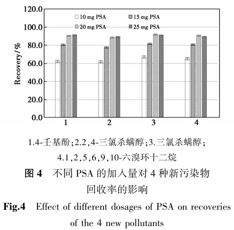 为了考察不同固相吸附剂加入量对4种新污染物回收率的影响,实验选取阴性空白土壤样品10 g,添加5 μL(100 mg/L)的混标溶液,测试PSA加入量在10、15、20、25 mg时对4种新污染物回收率的影响,各进行3次平行实验,按照1.2条件设定进行浓缩、净化,1.3仪器设定上机测试,由图4可知,在加入20 mg PSA时具有较好的回收率(88.4%~91.6%);考虑测定效果和试剂成本,实验选择20 mg PSA为固体吸附剂最优加入量。.jpg)