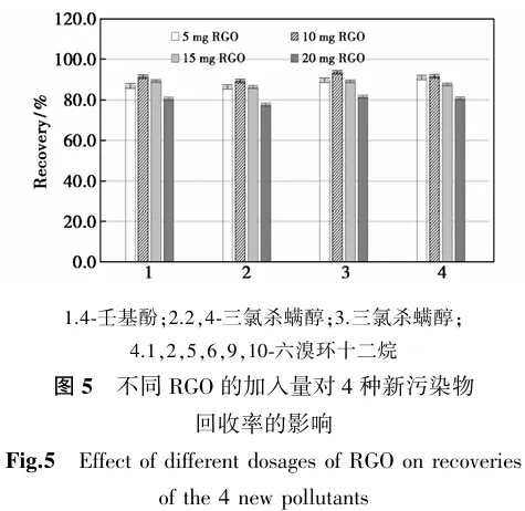 为了考察不同还原氧化石墨烯加入量对4种新污染物回收率的影响,实验选取阴性空白土壤样品10 g,添加5 μL(100 mg/L)的混标溶液,测试还原氧化石墨烯加入量在5、10、15、20 mg时对4种新污染物回收率的影响,各进行3次平行实验,按照1.2条件设定进行浓缩、净化,1.3仪器设定上机测试,由图5可知,在加入量为10 mg还原氧化石墨烯时,4种新污染物具有良好的回收率(89.4%~93.5%),因此,实验选择10 mg为还原氧化石墨烯最优加入量。.jpg)