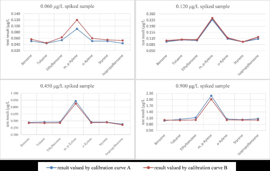 2. 甲醇试剂中苯系物本底的存在使标准曲线的斜率略有降低、截距增加,容易导致低浓度样品的测定值低于实际值,对生活饮用水,尤其是水源地水这类本身苯系物含量在检出限附近的水样测定结果影响较大。