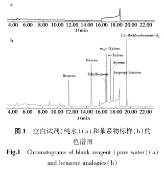 以1.2所示的P&T-GC-MS法分析条件,用纯水做空白试验,得到试剂空白图(图1a),与苯系物混合标样图(图1b)对比可知,纯水中未检出8种苯系物,对后续的实验研究不造成干扰。.jpg)