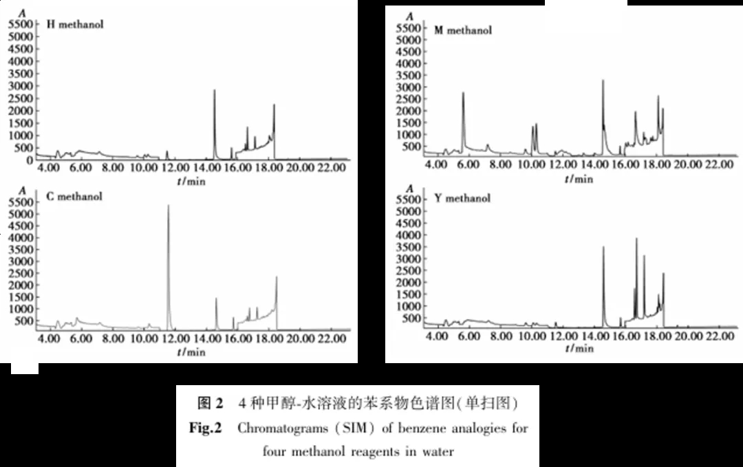 通过调查,选择市场占有率高且检测实验室VOCs分析普遍使用的4种典型甲醇试剂,即H、C、M和Y甲醇作为主要研究对象。质谱SIM模式分析结果(图2)显示,4种品牌的甲醇试剂均不同程度地检测到苯系物,其中C甲醇中苯的响应非常高;Y试剂中除苯外,其他苯系物的响应都高于其他3种试剂;M甲醇的单扫图中除苯系物外,尚有其他多种杂质峰,H甲醇的苯系物相对较少。4种甲醇试剂的苯系物响应情况见表2,从峰面积结果看,H甲醇的苯系物总量最少。综合图2和表2的结果,H甲醇是苯系物本底相对较少的甲醇试剂。.jpg)