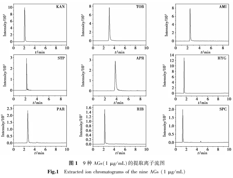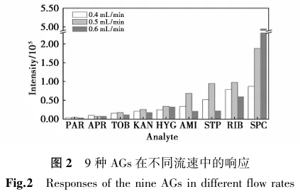 流动相的流速是色谱分离中的一个重要参数。对比了0.4、0.5、0.6 mL/min流速对9种AGs分离效果的影响。实验显示,当流速增加时,9种AGs的出峰时间均提前,目标物质的总分析时间缩短。同时,从图2可以看出,当流动相流速为0.5 mL/min时,TOB、KAN、AMI、HYG、STP和RIB的响应强度均高于另外两个流速的响应强度,故综合出峰时间和响应强度,本研究选择流速0.5 mL/min。.jpg)