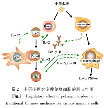 癌症是一种常见的恶性疾病,其对患者的生命健康会产生严重影响,在人类死亡原因调查中仅次于心血管类疾病,排在第二位[8]。目前针对癌症的主流治疗方案有:手术治疗,放射性及化学药物治疗,免疫治疗,而中药物多糖因其较低的毒副作用以及独特的生物学活性被广泛应用于癌症患者的治疗及预后过程中。目前中药多糖发挥抗肿瘤活性的作用机制大致可以分为4类:①对癌细胞的直接杀伤作用。②抑制肿瘤细胞生长增殖。③抑制肿瘤细胞的转移。④通过激活机体免疫系统发挥抑癌作用。2.2 中药多糖对免疫系统的调节作用