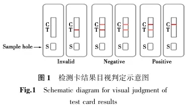 在规定时间内,通过比较T线与C线的颜色深浅进行结果判定。检测卡目视判定结果如图1所示,试纸条目视判定结果方法与检测卡相同。.jpg)
