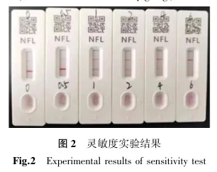 测定NOR不同浓度(0、0.5、1、2、4、6 μg/kg)的标准品,结果如图2所示。当浓度<2 μg/kg时,T线产生明显色差,而C线几乎无颜色变化,此时无法通过颜色确定NOR的精准浓度。当测定2 μg/kg的NOR标准品时,T线与C线呈现明显色差,因此灵敏度确定为2 μg/kg。.jpg)