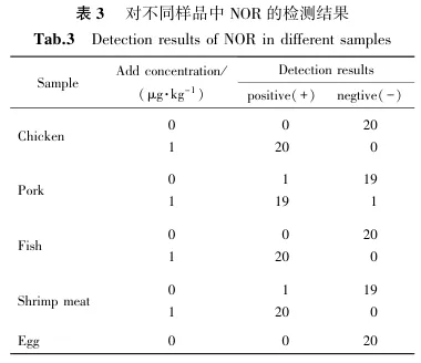 我国现行NOR检测标准包括GB/T20366-2006《动物源产品中喹诺酮类残留量的测定 液相色谱-串联质谱法》[21]、农业部1077号公告-1-2008《水产品中17种磺胺类及15种喹诺酮类药物残留量的测定 液相色谱-串联质谱法》[22]等。本实验选取GB/T 20366-2006标准作为参比方法,定量限为1.0 μg/kg。在市场随机抽取鸡肉、猪肉、鱼肉、虾肉、鸡蛋各20份,分别使用GB/T 20366-2006和NOR胶体金免疫层析法进行检测,考察不同基质样品中2种方法结果的一致性和相对准确度。2.3 方法性能评价