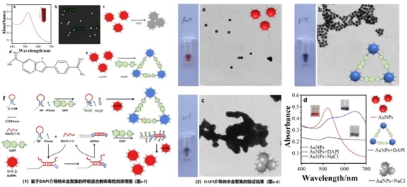 1. 研究发现,DAPI可作为新型诱导剂介导纳米金聚集,促使酒红色纳米金转变为蓝色,此方法的信号变化优于盐诱导法,更有利于肉眼判读结果;