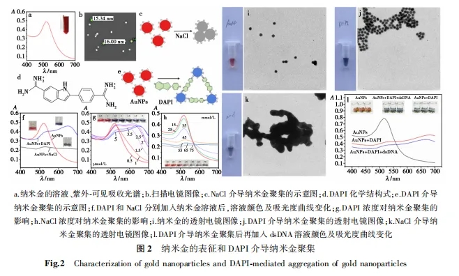 2.2 纳米金的表征及DAPI介导纳米金聚集分析