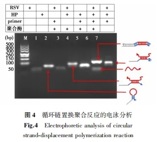 实验对反应产物进行琼脂糖凝胶电泳分析。如图4所示,泳道1、2为RSV序列条带和HP条带,作为实验对照条带。泳道3仅出现了RSV条带,Primer因只含8个碱基在电泳图上未显示,说明RSV与Primer不发生反应。