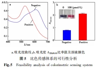 将不含RSV的阴性组和含RSV的阳性组进行信号对比。如图5a、5b所示,阴性组中无RSV序列,发夹探针和引物未发生聚合反应,溶液中核酸链与DAPI结合少,过量的DAPI介导纳米金聚集,使溶液变成蓝色,吸收峰在610 nm。阳性组中加入终浓度100 pmol/L的RSV序列,发生ICSDPR扩增反应,将发夹探针和引物聚合形成富含AT碱基对的dsDNA。