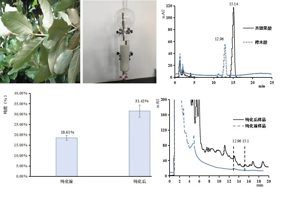 2.优化提取工艺后,银叶树三萜提取率为9.17 %;大孔树脂纯化后的萜类纯度提高了1.69倍;纯化后分离组分中二种三萜桦木酸与齐墩果酸含量较纯化前明显提升;