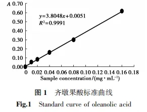 对不同浓度的齐墩果酸标准品溶液进行吸光度测定,测定所得数据经处理后,以浓度(mg/mL)为横坐标,吸光度(A)为纵坐标,作齐墩果酸标准曲线图如图1所示。