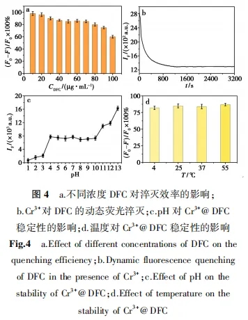实验首先对DFC的用量进行了优化,固定Cr3+的浓度,然后依次加入不同体积的DFC,使其终浓度分别为10、20、30、40、50、60、70、80、90、100 μg/mL,通过测试体系的荧光强度发现,当DFC浓度较低时,Cr3+对DFC的淬灭效率达到90%以上,当DFC在40~70 μg/mL浓度范围内时,淬灭效率几乎保持在85%左右,继续增大DFC用量,淬灭效率出现下降趋势(图4a)。