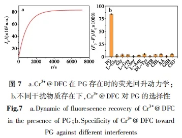 固定探针Cr3+@DFC的量,然后加入不同浓度的PG,在相同条件下测试体系的荧光强度。当加入PG后,Cr3+与PG分子上的N与-COOH之间形成稳定的螯合物,使Cr3+脱离了DFC的吸附,因此DFC的荧光得以回升。