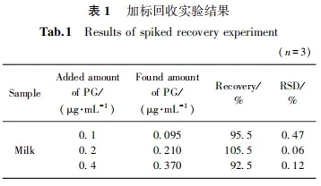 为验证分析方法的准确性,将构建的方法应用于牛奶样品中进行检测,并进行加标回收实验。结果如表1所示,加标回收率在92.5%~105.5%之间,RSD在0.06%~0.47%之间,表明所构建的分析方法准确度高,可应用于实际样品中PG的检测。